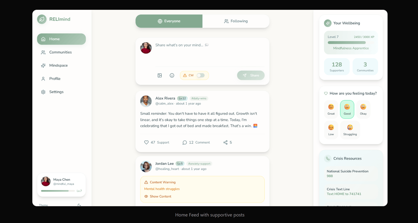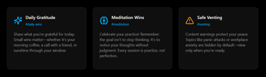 RELImind's feed is designed to foster genuine connection. Share gratitude lists, meditation milestones, or moments when you need support, all within a safe, moderated environment.